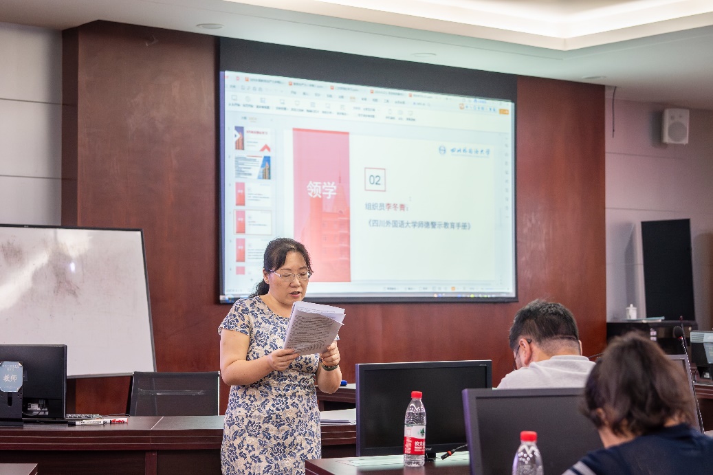 接着,李冬青老师进行了《四川外国语大学师德警示教育手册》领学,从实际案例出发,鼓励各位老师以德立身、以德立学,加强自身修养,加强师德师风建设,培养德智体美劳全面发展的社会主义接班人。
